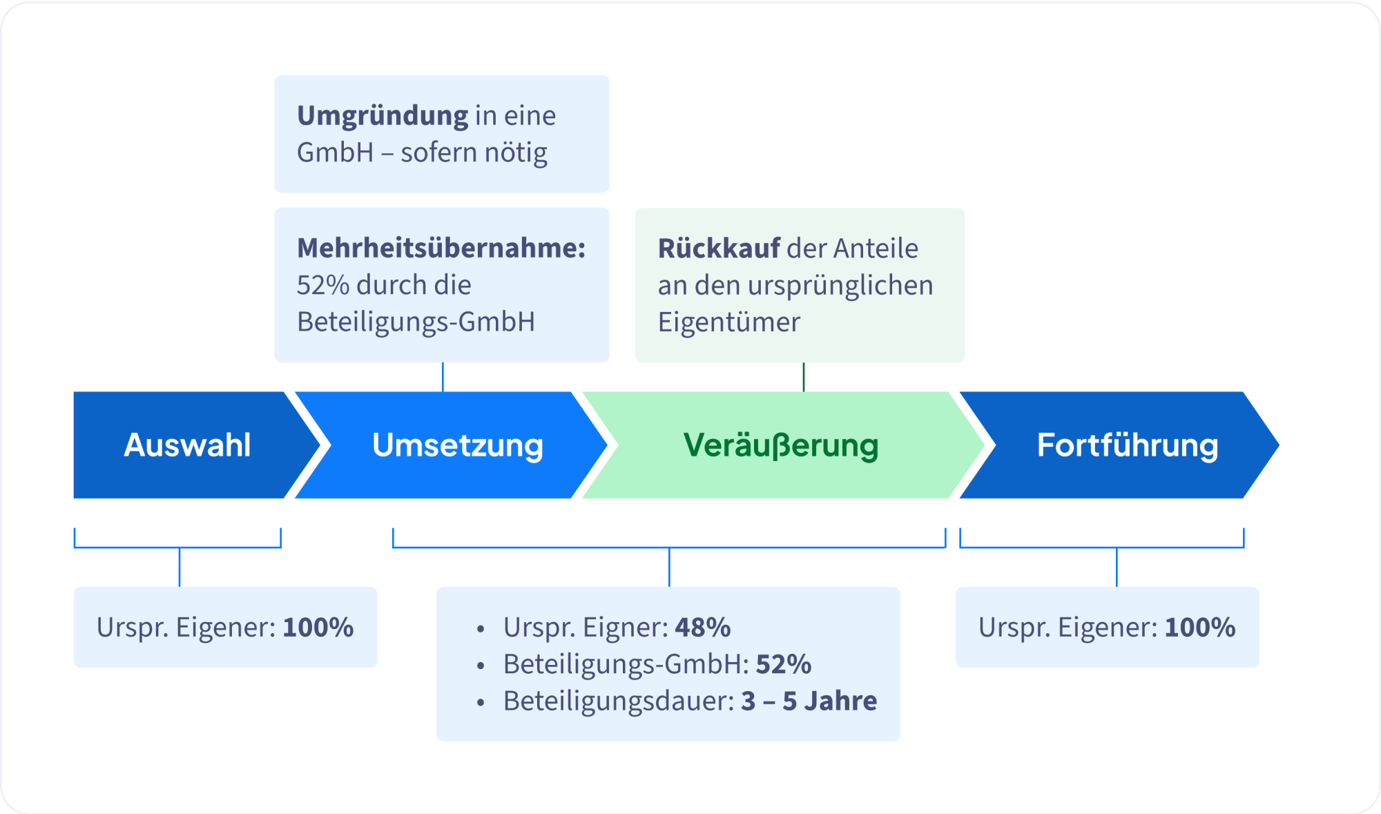 Nach erfolgreicher Umsetzung des 5-Säulen-Konzepts werden die Anteile nach 3–5 Jahren unter fairen Bedingungen an den ursprünglichen Eigentümer zurückgeführt.Ziel ist es, die Anteile zum Richtwert des letzten Geschäftsjahres an den Miteigner zu veräußern, sofern das Betriebsergebnis des Zielunternehmens über 72.000 EUR liegt.
